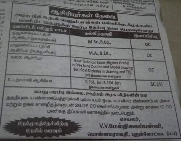 Tn Govt Aided School V V Higher Secondary School Recruitment Pg Assistant In Botany And Economics Drawing And Physical Education Teacher Post Govt Jobs Portal